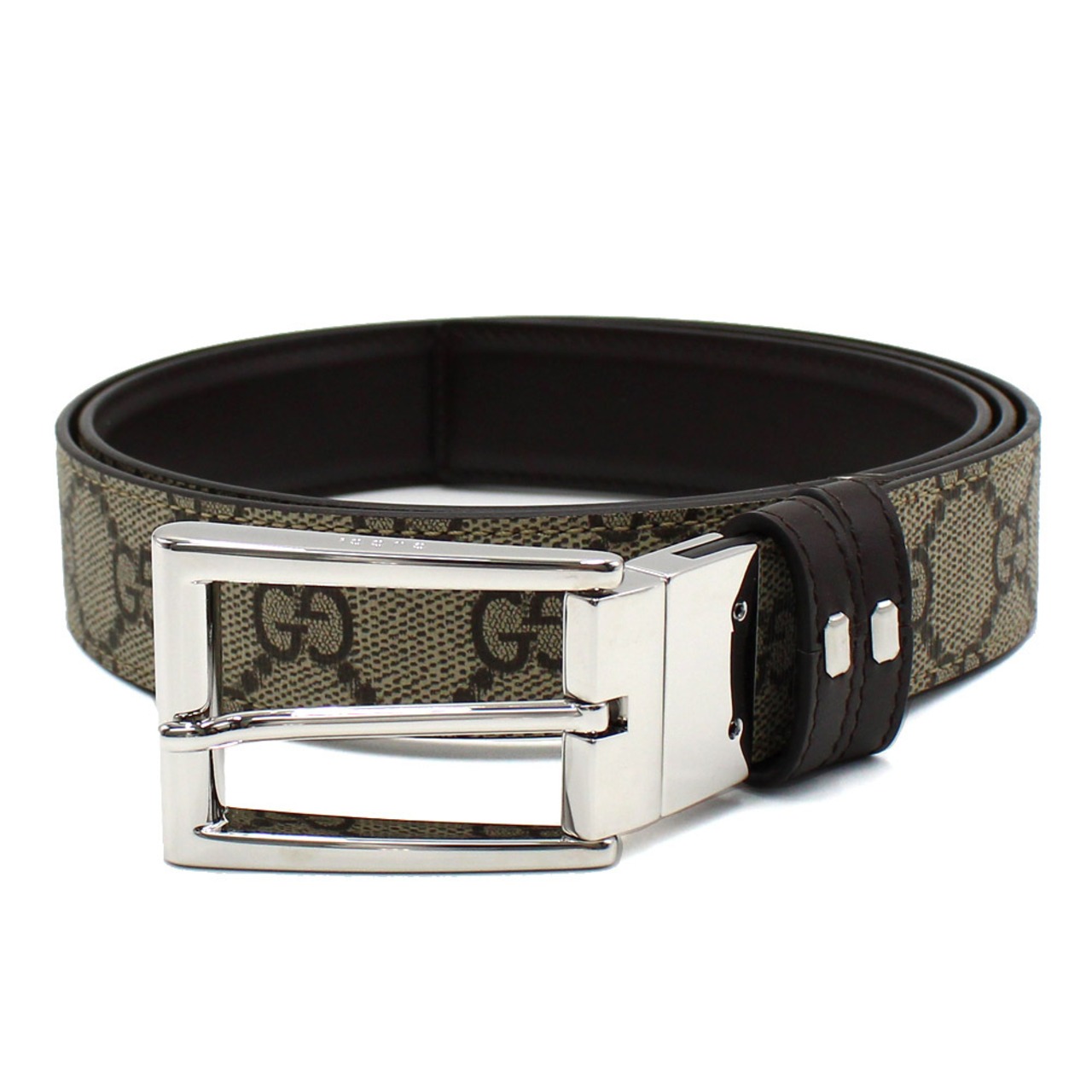 GUCCI LETHER CANVAS BELT 771105 BTTAN 2158 D.BROWN BEIGE 85 90 100 グッチ ベルト レザー キャンバス GG スプリーム 回転バックル リバーシブル メンズ ダークブラウン ベージュ